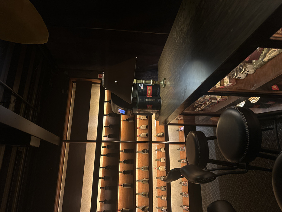 A dimly lit bar area features a wine rack filled with bottles