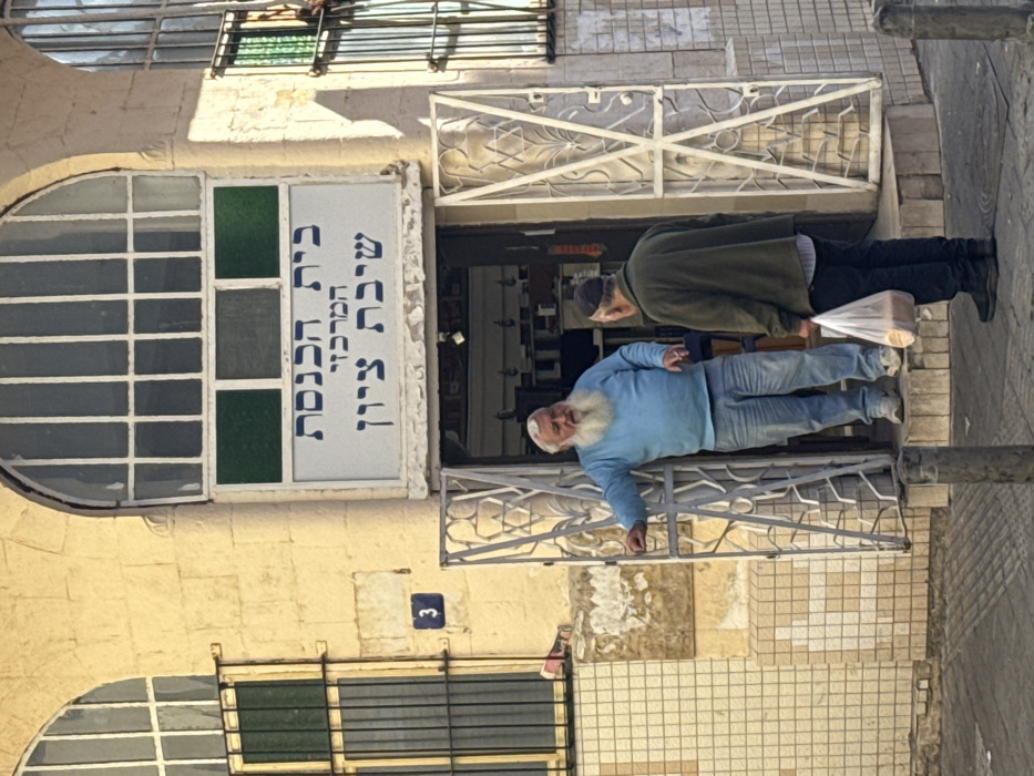 A daytime street scene in Tel-Aviv, Israel, depicts two men engaged in conversation outside "The Central Synagogue Shivat Tzion