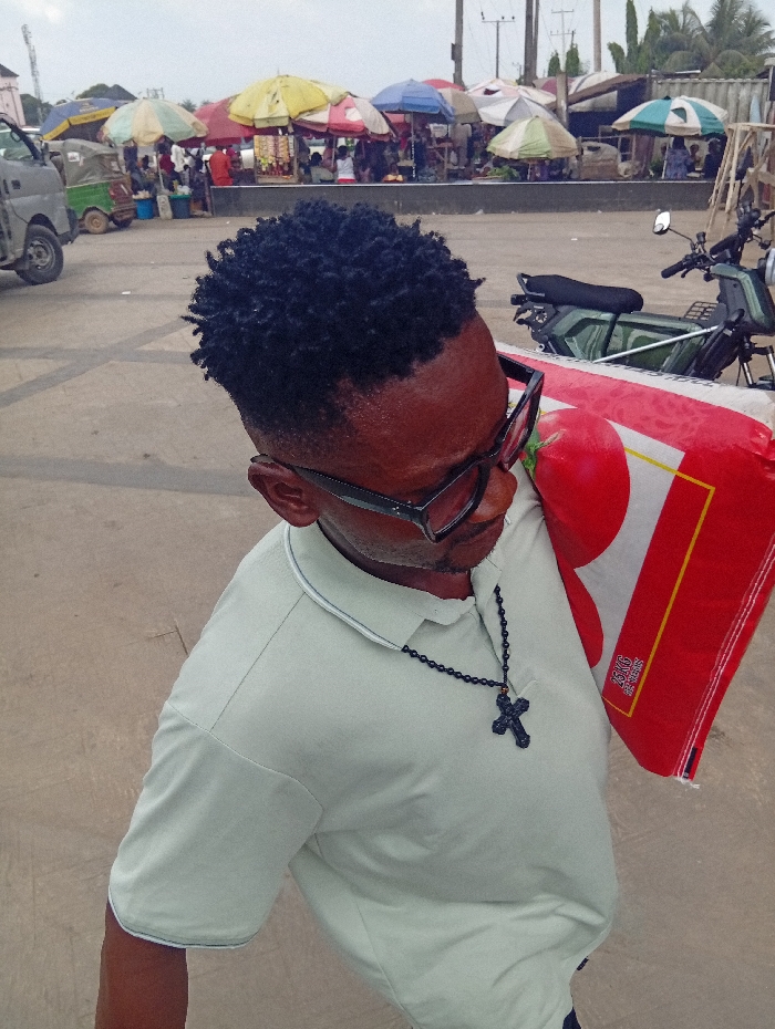 The image depicts an outdoor market scene in Ura Nta Umuarandu, Nigeria. In the foreground, an individual with dark skin, short curly black hair with faded sides, wears a light green collared shirt with white trim, black-framed eyeglasses, and a dark beaded necklace with a black crucifix. This person carries a large red and white striped bag, emblazoned with a red sphere graphic, over their left shoulder, facing right. The background reveals a bustling market environment characterized by numerous stalls, each sheltered by colorful umbrellas in shades of red, yellow, blue, and white. Multiple people are visible engaging in market activities. Vehicles present include a grey utility truck, a green and yellow motorized tricycle, and a dark green motorcycle. Utility poles with overhead wires, distant buildings, and sparse greenery are discernible under an overcast sky, on a light-colored paved surface.