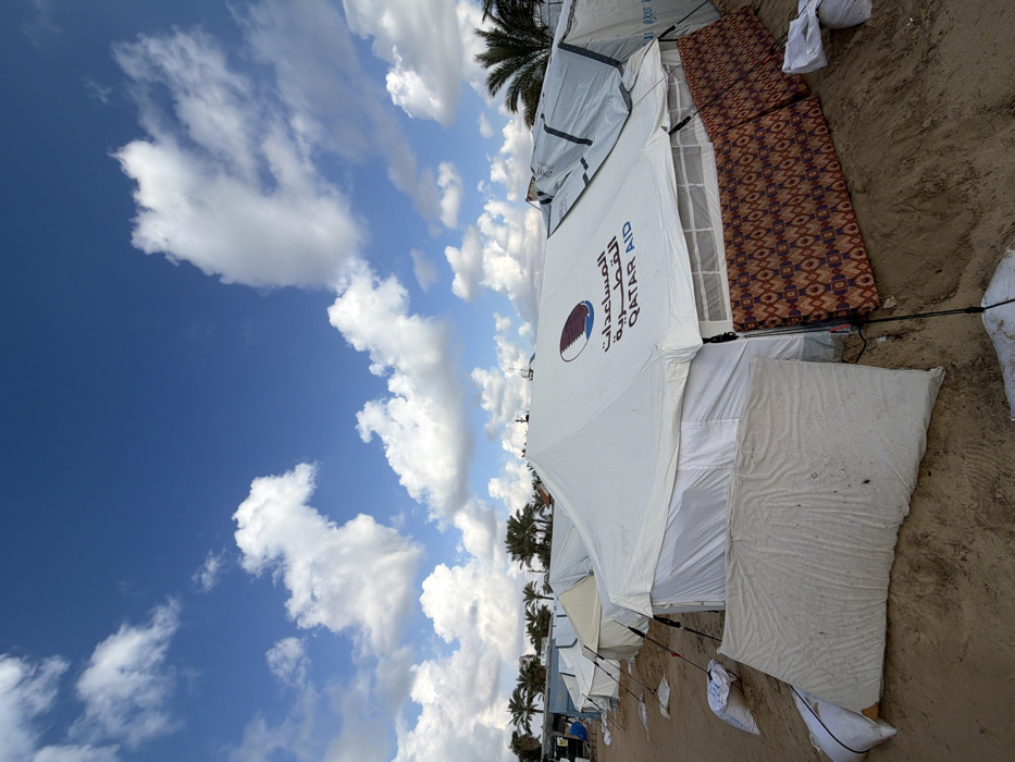 This image depicts a temporary settlement or encampment located in a-Zawayda, Palestinian Territory. The foreground is dominated by a large white relief tent with "QATAR AID" printed on its side in English and Arabic ("المساعدات القطرية"), accompanied by the Qatar national flag emblem. The tent is secured with visible guy lines and weighted down by white sacks, presumably filled with sand, around its base. Leaning against the tent's exterior, on the left, is a plain, light-colored mattress, while two patterned mattresses with red, orange, and brown geometric designs lean against the right side. To the left and slightly behind the main tent, a row of several similar white and light-colored tents extends into the distance, indicating a larger camp structure. Another tent, partially covered with what appears to be a grey or blue tarp, is visible immediately to the right of the main tent. The ground beneath the tents is sandy and barren. In the background, numerous palm trees are visible, characteristic of the region. The sky above is a bright blue, dotted with scattered white cumulus clouds. No individuals or direct actions are depicted.