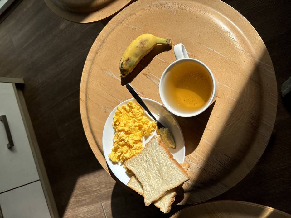 A breakfast arrangement rests on a wooden tray. A plate holds scrambled eggs and white bread toast, accompanied by a black knife. Adjacent to the plate is a white mug filled with a yellow liquid. A slightly bruised banana completes the meal. The scene is illuminated by bright sunlight, casting harsh shadows across the tray and surrounding surface.