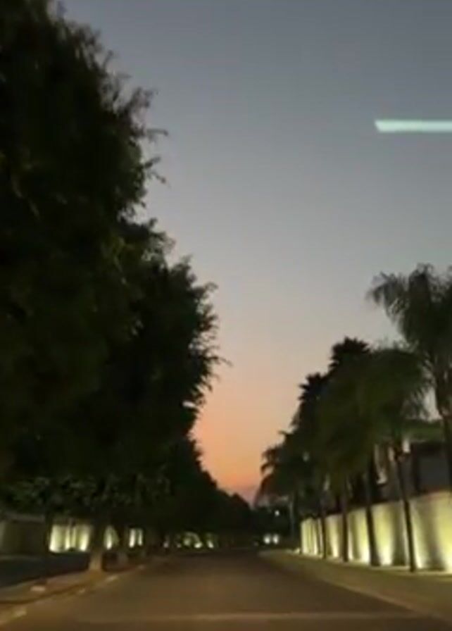 car driving down a paved road lined with trees, including some palm trees, under a sky that is turning from dusk to night. The trees are planted along a light-colored wall. Small lights illuminate the wall at regular intervals. The sky has shades of gray and a hint of orange where the sun has set. The video is taken from the perspective of someone in the car. There are no visible people.