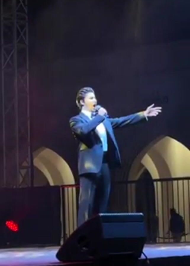 On a brightly lit stage, a man in a dark suit with a white shirt and bowtie is singing into a microphone with his right arm outstretched. He is standing on a black speaker. The background behind him is an architectural wall featuring multiple arched shapes and is adorned with a logo that reads "Malko". A large metal truss structure stands to the left of the stage. There are people in the background who are out of focus. The stage itself is illuminated with red and white lights.
