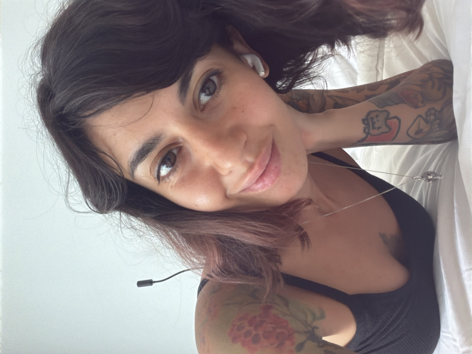 A woman with dark brown hair and brown eyes smiles at the camera. She has tattoos on her neck and arms, and is wearing a black tank top. A white earbud is visible in her ear. She is lying on a white surface, likely a bed.