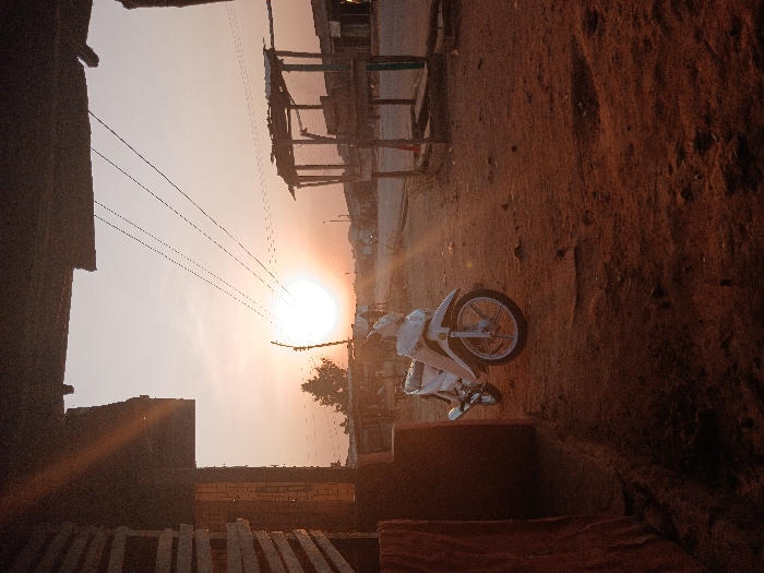 A sun-drenched scene with a white motorcycle parked on a dirt road beside a low, dark brown structure. Buildings and a market stall are visible under a bright sky. Telephone wires stretch across the scene. The color palette is dominated by warm tones, highlighting the harsh lighting and dusty environment.