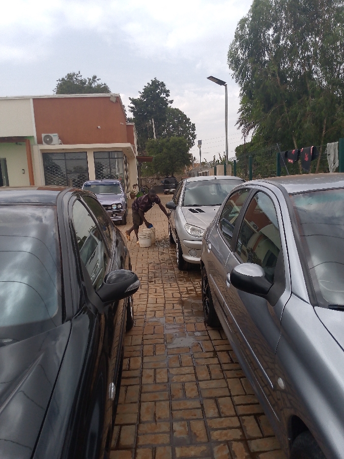 A wide shot depicts an outdoor car washing scene in Jos, Nigeria, under an overcast sky