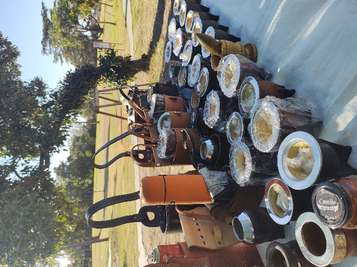 An outdoor market stall, located in a grassy park in Ricardo Rojas, Argentina, is presented under bright daylight. The foreground features a long table covered with a white cloth, displaying numerous handcrafted items primarily consisting of mate gourds and accessories. Dozens of mate gourds, varying in material such as wood, leather-wrapped, and metal-rimmed designs, are arranged on the table; many are individually wrapped in clear plastic. Several tall, cylindrical leather carriers with black straps are visible, some designed for thermos bottles, one prominently holding an orange thermos. Other leather pouches and bags, featuring stitching and rivets, are also present. A red cylindrical object is partially visible on the far left. A small glass jar with a black lid, labeled "Camillo," is placed among the mate cups in the lower-left. A wooden mortar and pestle set stands on the right side of the table. The background reveals a wide expanse of green lawn, numerous mature trees with full green foliage, a visible dirt path or road, and a distant wooden structure. No individuals are visible interacting with the stall or its contents.