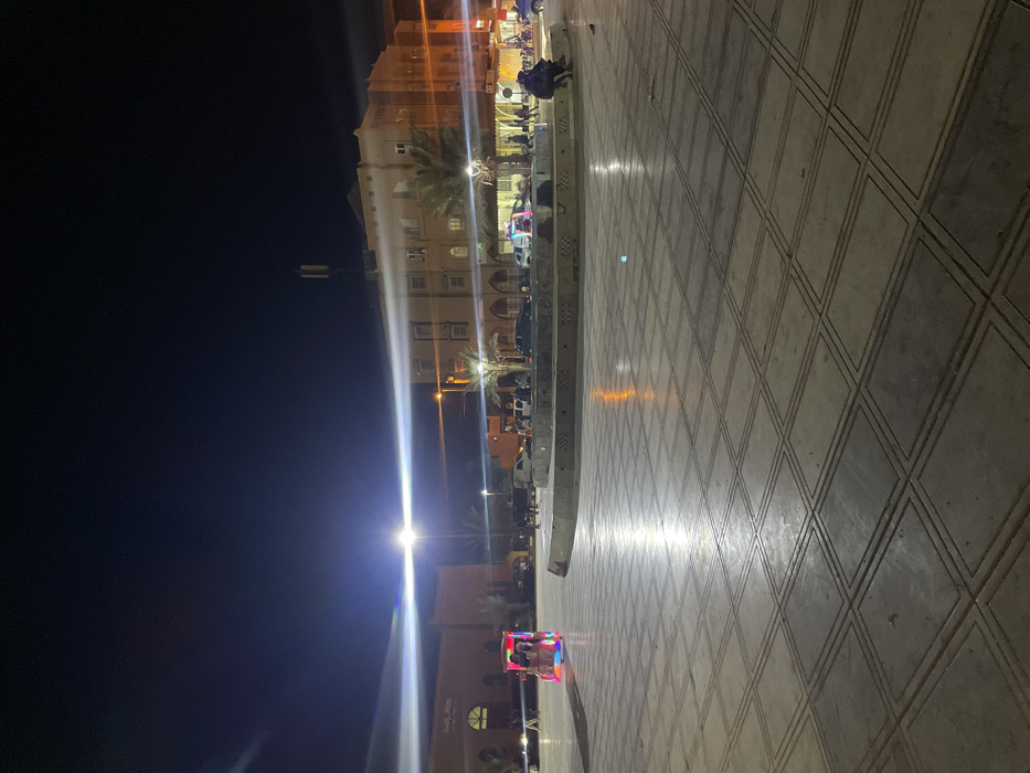 An eye-level, outdoor nighttime shot depicts a lit-up town square. The foreground features a diamond-patterned, tiled surface. A low, rectangular structure is positioned to the left, occupied by individuals. Further back is a multi-story building with lit windows and palm trees, with the black night sky filling the upper left. A bright streetlamp shines into the scene. In the lower section of the image is a child's toy, with lights in it.