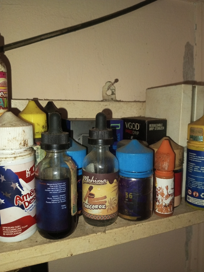 A cluttered shelf displays an assortment of vaping liquid bottles. "American Dessert," a blue liquid in a bottle, and "Mahima Chocoroz" are visible, alongside bottles with labels like "VGOD Pro Drip," a nicotine level of "36 milligrams" and a note about not using during pregnancy. Indonesian text and ingredients like vegetable glycerin are featured on the labels. The shelf also contains a Rebuildable Drip Atomizer box. Dust and grime are apparent, adding to the chaotic feel of the storage space.
