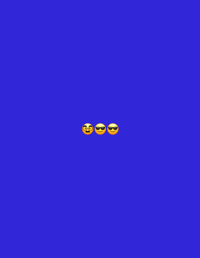 Three yellow emoji icons line the lower center of a blue background. From left to right, the first emoji wears glasses, the second has a simple sunglass design, and the third has a sunglass design with slightly curved arms. The icons appear to be floating in empty space.