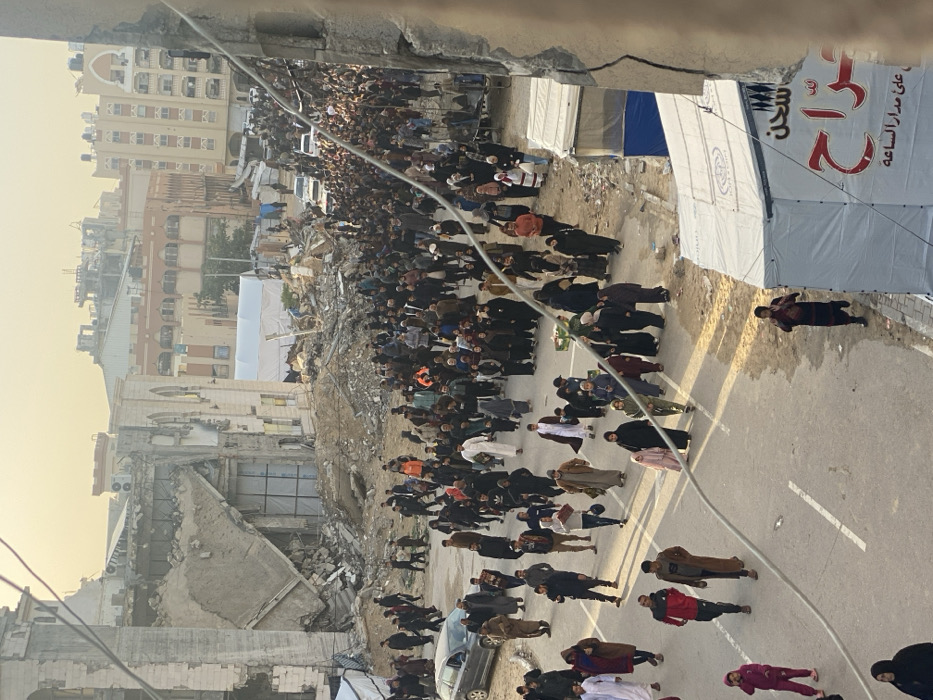 The image presents an elevated view of a wide street in a heavily damaged urban area of Khan Yunis, Palestinian Territory, populated by hundreds of civilians