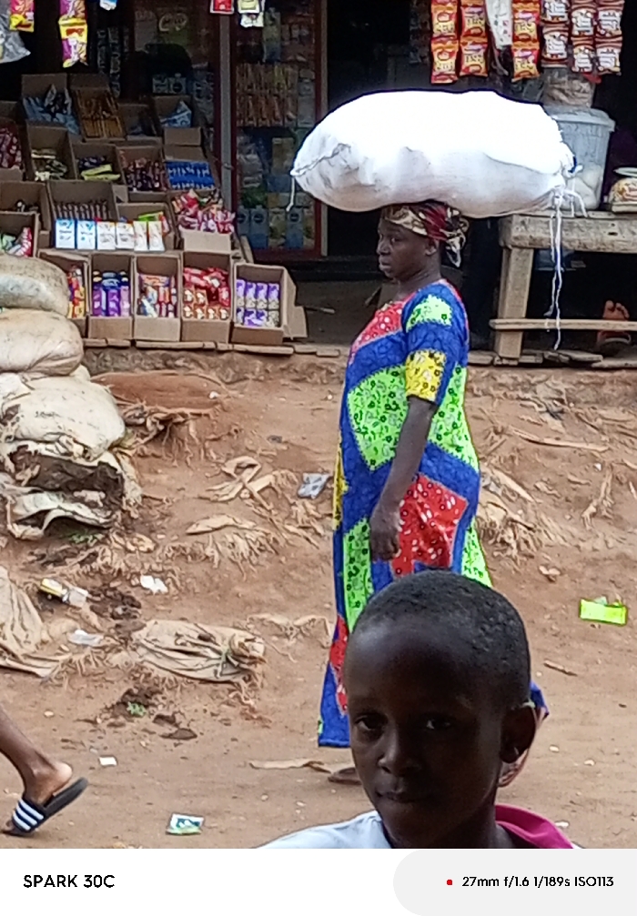 This image captures an outdoor street scene in Onitsha, Nigeria. The immediate foreground and mid-ground consist of an unpaved, reddish-brown dirt surface, uneven and littered with various debris including crumpled paper and plastic. In the mid-ground, a dark-skinned adult female is depicted standing or walking. She wears a long dress patterned with blue, green, red, and yellow geometric shapes, and a patterned headwrap. A large white sack is balanced on her head. Her gaze is directed towards the left of the frame. To her left, a stack of multiple large, light-colored sacks is visible. In the background, a retail establishment operates, displaying numerous packaged goods in open cardboard boxes and hanging from an overhead fixture. A dark opening suggests an entrance or service window, with a simple wooden bench or table situated to its right. In the lower-right foreground, the head and upper shoulders of a dark-skinned young boy with short hair are visible, looking directly at the camera. He wears a light-colored shirt with a magenta collar. In the lower-left corner, the left foot of an unidentified individual is present, wearing a black slide sandal with three white stripes.