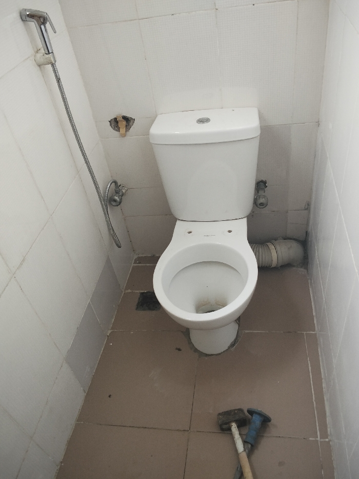 A forensic examination of the image reveals a confined, utilitarian restroom space, likely located in Unknown, Unknown. The area is characterized by white square tiles on the walls and larger, square brown/beige tiles on the floor. Dominating the center is a white, two-piece ceramic toilet, positioned against the back wall. The toilet bowl lacks a seat, exposing the two mounting holes on its rim, and exhibits interior discoloration/staining. A flexible grey corrugated pipe connects the toilet's rear to a larger diameter grey PVC drain pipe extending along the lower right wall. To the left of the toilet, mounted on the tiled wall, is a chrome bidet sprayer connected to a metallic flexible hose, which descends to a visible stopcock. Below and to the right of the bidet sprayer, a circular void is present in the wall tiles, revealing underlying material. Additional plumbing, including a stopcock, is visible on the right side of the toilet tank. The tiled floor appears dusty and bears scattered debris. A dark square floor drain is visible near the left side of the toilet base. In the bottom right corner of the frame, two tools are present: a hammer with a dark head and a wooden handle, and a blue-handled tool resembling a small plunger or mallet with a dark rubberized end. The overall scene suggests a state of incomplete construction, renovation, or disrepair. No individuals are present.