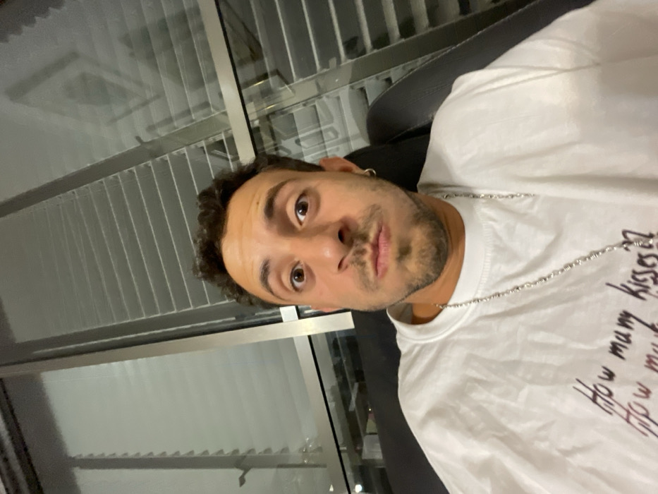A single male individual is depicted in a close-up, selfie-style indoor portrait. He has short, dark, curly hair, a short beard, and olive skin. He wears a white crew-neck t-shirt with partial dark text on the lower left, reading "How many kisses?". A silver-colored chain necklace is visible around his neck, and a silver-colored hoop earring is in his left ear. His facial expression includes wide eyes and pursed lips. He is seated, with parts of a dark chair or seat visible. The background consists of a large window or glass partition fitted with horizontal blinds, with a faint reflection of a framed object visible on the right. The location within the city of Unknown, Unknown, cannot be identified from the image.