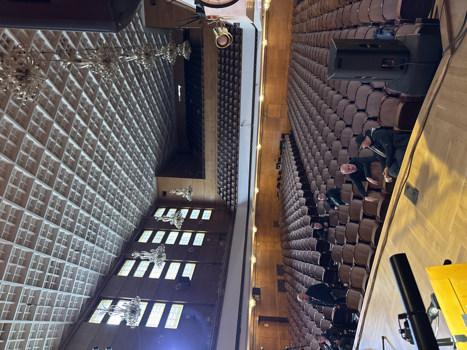 The image depicts the main hall, identified as Hall 1 of the National Palace of Culture (NDK) in Sofia, Bulgaria. The scene shows a large, largely empty auditorium during what appears to be a pre-event or setup phase. The hall features a prominent white, grid-patterned (waffle) ceiling from which several multi-tiered crystal chandeliers are suspended. Tall, rectangular windows with multiple panes line the upper left wall, providing natural light, supplemented by wall sconces and internal illumination. The walls below the windows and balcony are finished with warm-toned wooden paneling. The auditorium is filled with numerous rows of brown-upholstered seats with dark wooden backs, arranged in a tiered fashion across the main floor and an upper mezzanine/balcony section. Most seats are unoccupied. In the foreground, a light-colored wooden stage floor is visible. On the right side of the stage, a large black audio speaker rests on a stand. In the lower-left foreground, a partial view of a yellow object and a black cylindrical device on a stand is present. Approximately eight to ten adult males are sparsely distributed within the lower seating area and on the stage perimeter. Their attire is casual, consisting primarily of dark jackets and shirts. Two men are seated on the stage edge, appearing to be in conversation. Other individuals are either standing in aisles or seated casually among the empty rows of seats. No active performance or large gathering is in progress. The overall environment suggests a state of preparation or observation within a public events venue.