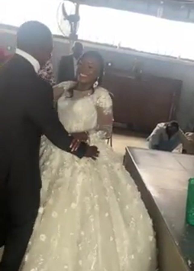 A bride and groom are dancing together. The bride is wearing a white ballgown with floral appliques and lace sleeves. The groom is wearing a black suit. They are in what looks like a church hall or event space with metal tables and folding chairs. There are other people in the background. One person is crouched on the floor adjusting equipment. A box fan hangs from the ceiling.