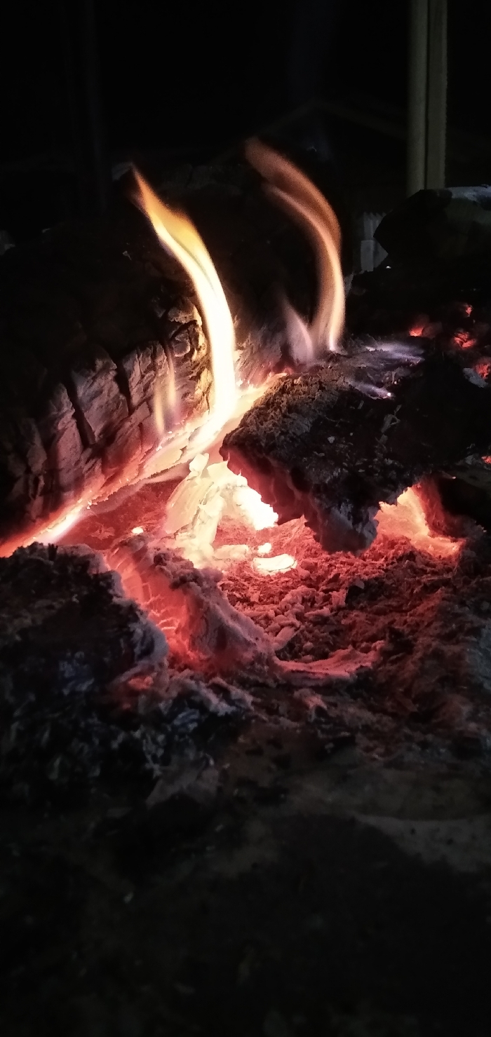 - "A crackling campfire dominates the scene, featuring burning logs with bright orange and yellow flames leaping upward" by FM-Vamwy2, licensed under CC BY 4.0