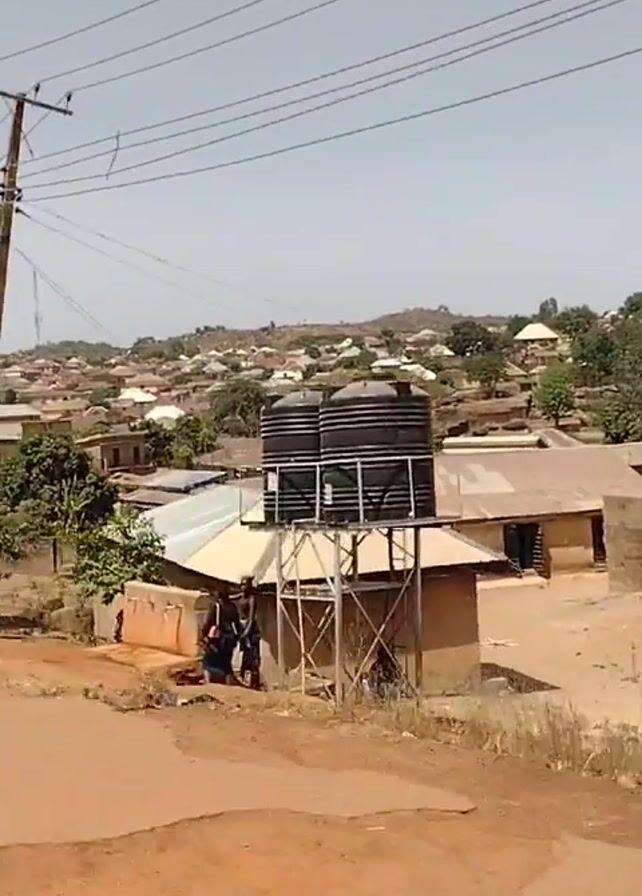 view of a somewhat rural residential area. It opens with a static shot of houses, some of which have corrugated metal roofs, and a large black water tank on a platform. A person walks down a dirt road in the distance. The camera then begins moving, revealing two boys carrying a bucket together down the road. They are followed by a black sedan with a license plate that reads "JN228NC" and a green auto rickshaw. The camera continues moving, providing a view of the landscape. The weather appears to be sunny, with a clear sky, and the environment is dusty and dry. The power lines and telephone poles are also visible, crisscrossing the sky above the houses.