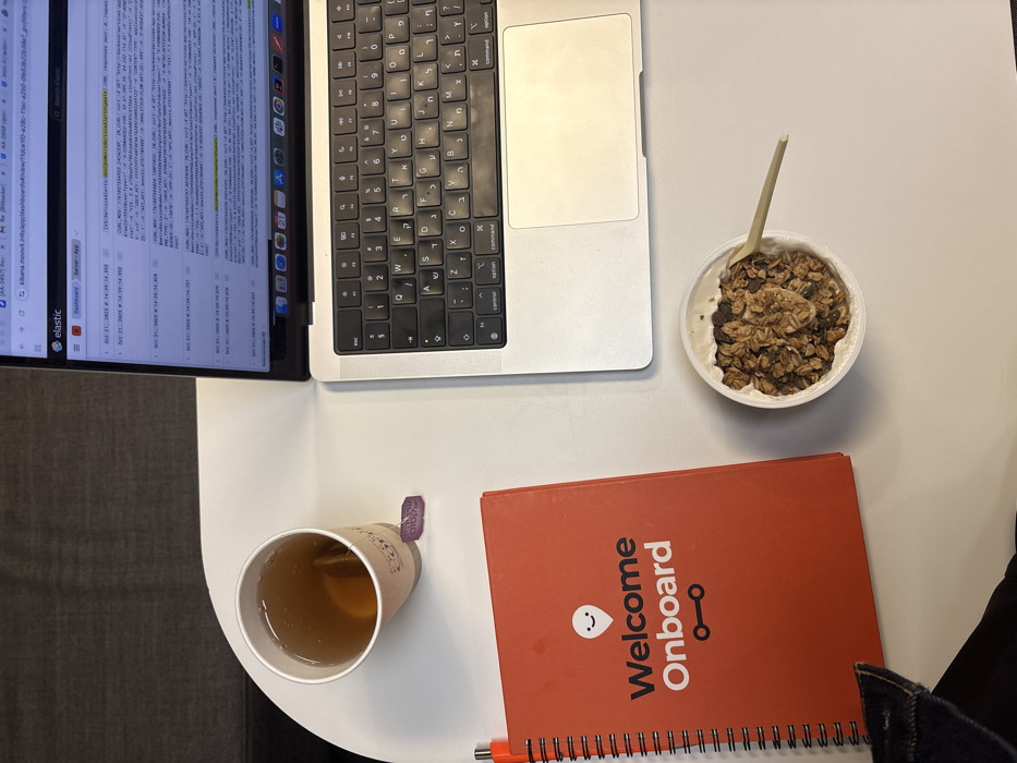 An overhead shot depicts a white table surface in Nes Ziona, Israel. A silver laptop, appearing to be a MacBook Pro with a Hebrew keyboard layout, occupies the right side, displaying an "elastic" Kibana dashboard on its screen. The screen shows data logs with timestamps (e.g., Oct 21, 2023), cURL commands, and mentions of "kibana.moovit.info" and "backend-services-app". To the left of the laptop, a white paper cup holds a light brown liquid, likely tea, with a purple-labeled tea bag (bearing Hebrew text "מרגנית", Marganit) submerged. Below the cup, a red spiral-bound notebook is positioned, displaying a white "Welcome Onboard" text with a smiling face logo above and two connected circles below. An orange pen is partially visible near the top left of the notebook. In the lower right quadrant, a white bowl contains a serving of yogurt topped with granola, and a light-colored spoon rests within the contents. A dark gray upholstered surface, possibly a couch or chair, is visible in the upper left background.