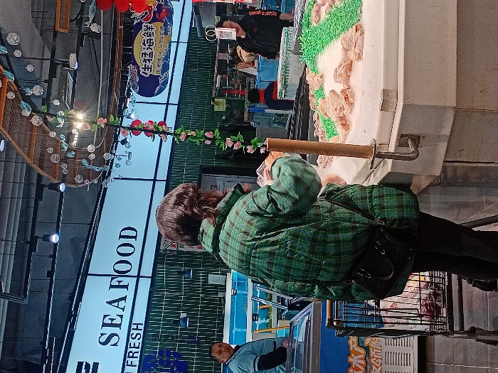 At a grocery store, a person wearing a green plaid jacket is at the seafood section. A sign with the word "SEAFOOD" in bold, all-caps lettering is visible. The seafood display contains various items on ice. Another person, presumably an employee, is standing nearby. A shopping cart is positioned near the person selecting seafood. Decorations hang from the ceiling.