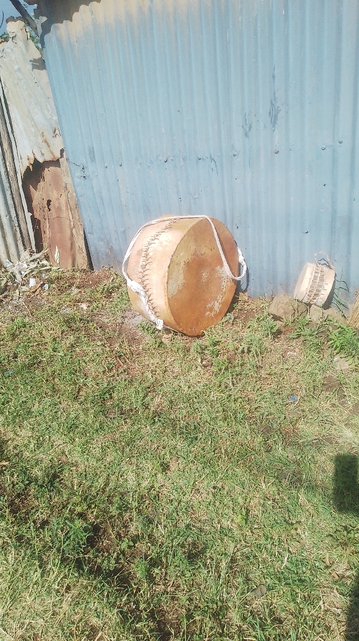 A weathered drum rests on green grass next to a corrugated metal structure. The drum is round, tan, and secured with a white rope around its circumference. A smaller, similar object sits nearby. The metal structure behind the drum is blue and gray, appearing old and worn. Patches of dirt and debris mingle with the grass.