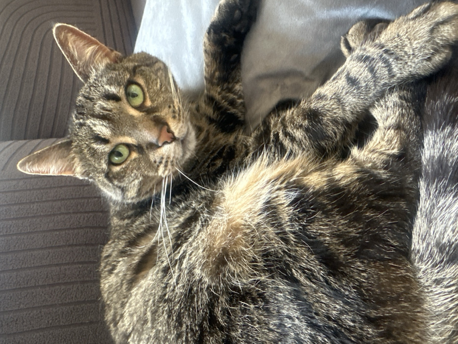 - "An indoor photograph depicts a domestic short-haired tabby cat lying on a light grey fabric surface" by FM-sLbVd2, licensed under CC BY 4.0