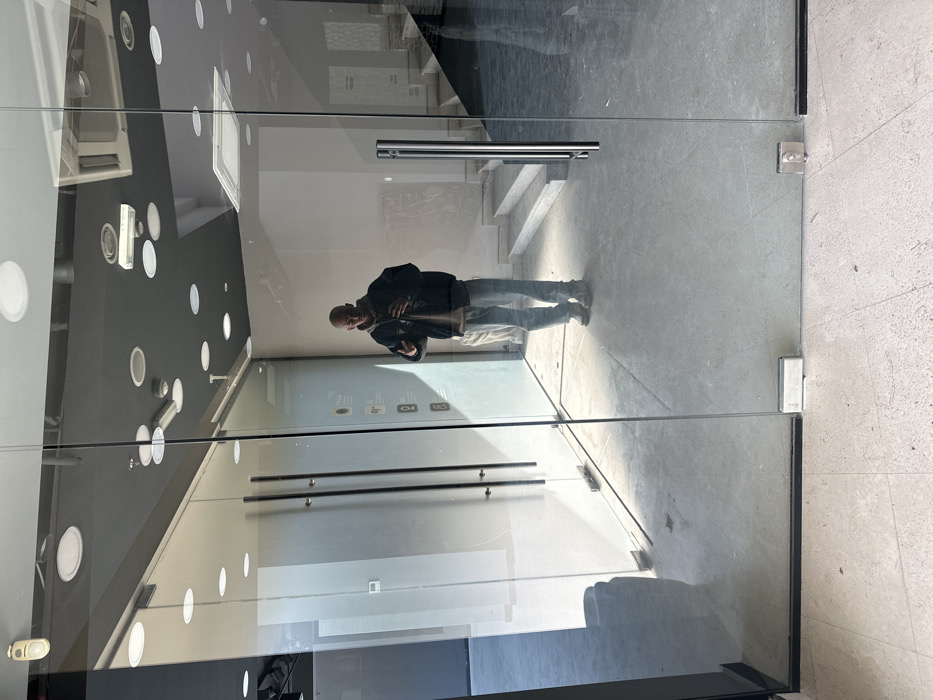 An image captures a full-body reflection of an individual standing inside a commercial space, viewed through a glass storefront in Budva, Montenegro. The individual, appearing bald, is dressed in a dark jacket over a lighter-colored hoodie, light blue jeans, and dark footwear. Their hands are positioned in front of their torso, with the left hand exhibiting a 'peace' or 'victory' sign gesture. The interior reflected space features a light grey concrete floor and light-colored walls, suggesting an unfinished or minimalist commercial establishment. The ceiling is dark grey with numerous circular recessed lights. An air conditioning unit is visible on the ceiling towards the right. To the right of the individual, a set of light-colored steps ascends. A second glass partition is visible further back within the space, along with what appears to be abstract markings or art on a wall. Sunlight illuminates parts of the interior floor. The exterior foreground, visible below the glass doors, consists of light-colored square floor tiles. The glass storefront itself comprises large panels, with visible metal hinges and handles on the doors.