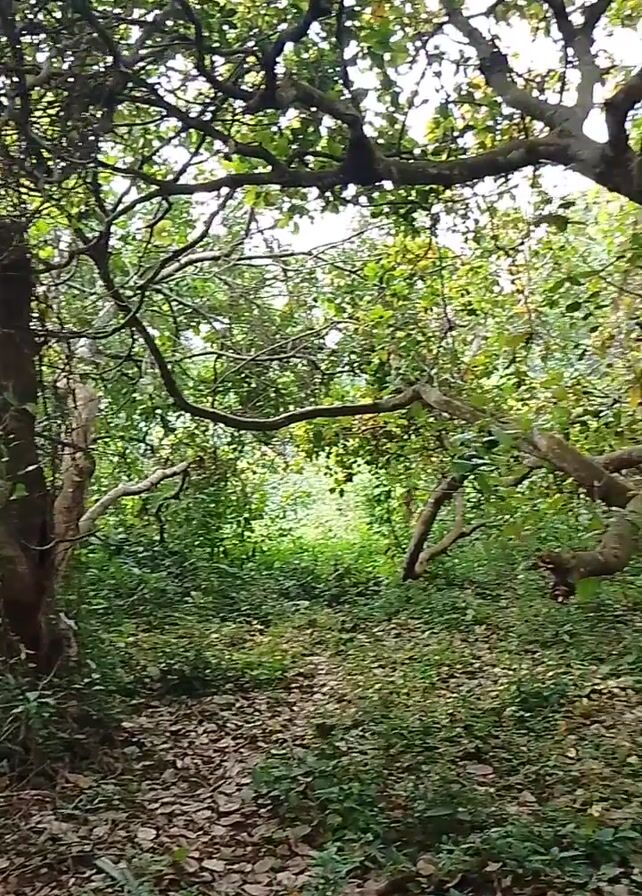 forest path. The path is narrow and made of dirt and leaves. There are trees on either side, with branches extending over the path. The foliage is mostly green, but there are some brown leaves on the ground.