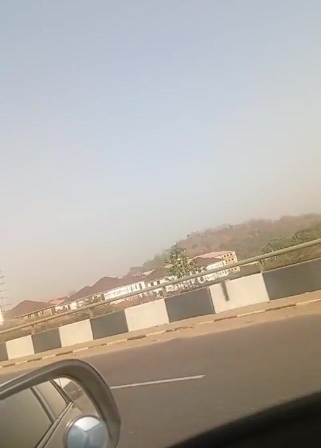 From a vehicle, the camera captures the view from the passenger window as the car moves along a highway, revealing the passing scenery. Visible is a section of the road separated by a concrete barrier with alternating black and white stripes. In the background, residential buildings, partly obscured by a hazy atmosphere, sit on an elevated surface. An unfinished multi-story building, still surrounded by scaffolding, stands out in the distance. The sky is clear and bright, suggesting daytime, and the car’s side mirror is visible, reflecting the interior of the vehicle and a small portion of the outdoor scenery. The text 'OBJECTS IN MIRROR ARE CLOSER THAN THEY APPEAR' is seen in the side mirror.
