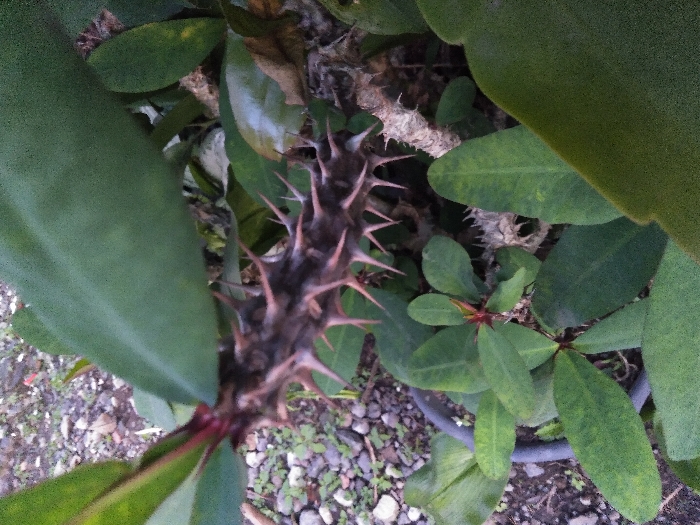 - "The image displays a close-up, top-down view of a thorny plant, specifically a segment of a spiny stem, likely from a *Euphorbia milii* (Crown of Thorns) species, located in the city of Taungpi, Myanmar (Burma)" by FM-6k6Sh1, licensed under CC BY 4.0