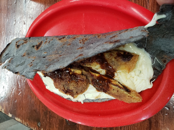 - "A blue corn tortilla is folded over white cheese and strips of fried plantain" by FM-zKXAq1, licensed under CC BY 4.0