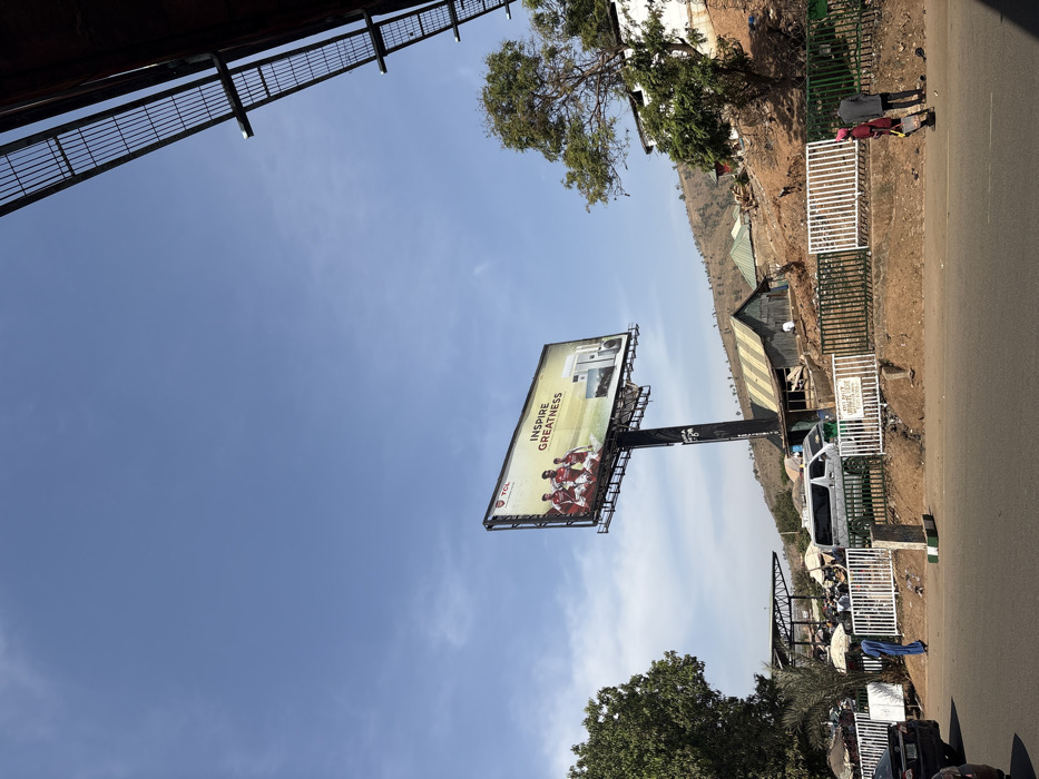 This image depicts a street scene in Nyanya, Nigeria, under a clear blue sky. A large billboard with the text "TCL INSPIRE GREATNESS" and images of football players (likely from Arsenal FC) and home appliances dominates the center. The billboard is mounted on a tall, dark support structure. Below the billboard, a multi-lane asphalt road extends horizontally. On the left side of the road, a dark vehicle is partially visible. Further back, behind a low white and green metal fence, a white minivan is parked near a gathering of individuals, some under umbrellas, suggesting a market or transit point. One person in a blue garment is walking on the road near the fence on the left. To the right of the billboard, a steep, dusty hillside rises, featuring several structures with corrugated metal roofs and some whitewashed buildings. Sparse trees and vegetation are present on the hillside. Two individuals, one in a dark suit and another in a pink head covering, are walking on the right shoulder of the road, adjacent to the fence separating the road from the hillside. In the upper right quadrant, a metal grated structure, possibly part of an overpass or an elevated walkway, extends diagonally into the frame. The overall scene indicates a busy urban or semi-urban environment with commercial activity and residential structures built into the natural hilly terrain.