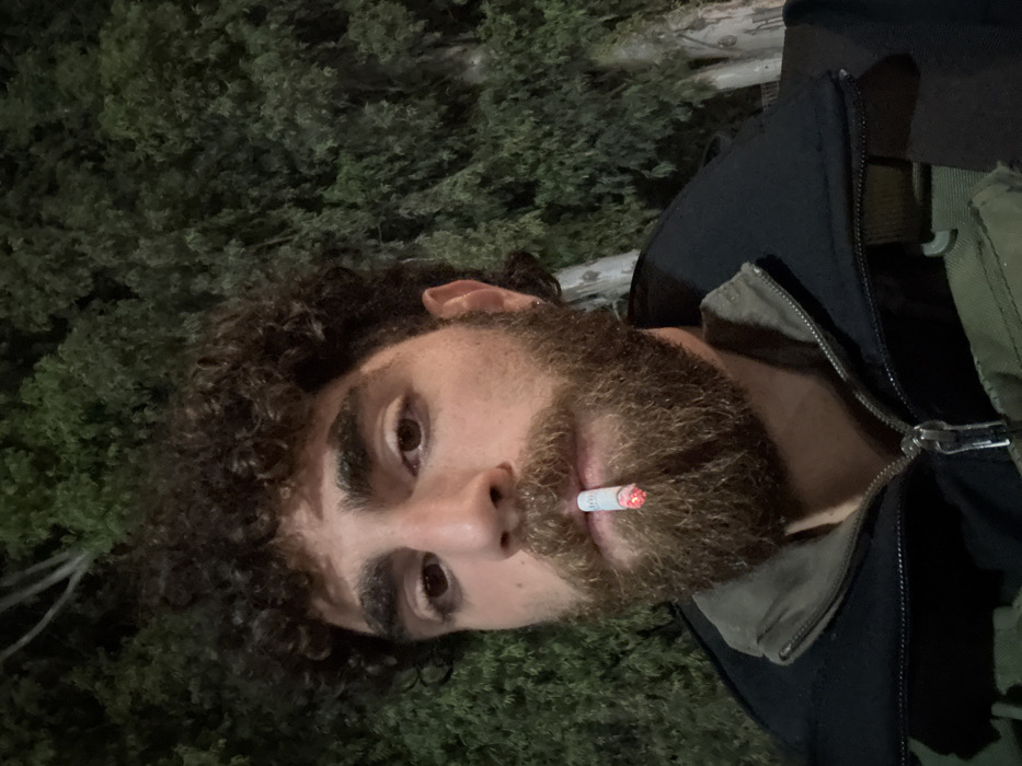 A male individual is depicted in a close-up, chest-level portrait, set against a dark, blurred background of dense green foliage. He has dark, curly hair, a full beard, and a mustache, with brown eyes. He is wearing a dark-colored jacket featuring a prominent silver zipper, layered over an olive-green garment that includes a visible shoulder strap. A lit cigarette, displaying an orange glow at its tip, is held between his lips. His gaze is directed towards the viewer. The environment suggests an outdoor setting at night. The specific location within the Brener Regional Council, Israel, cannot be identified from the visual data present in the image.