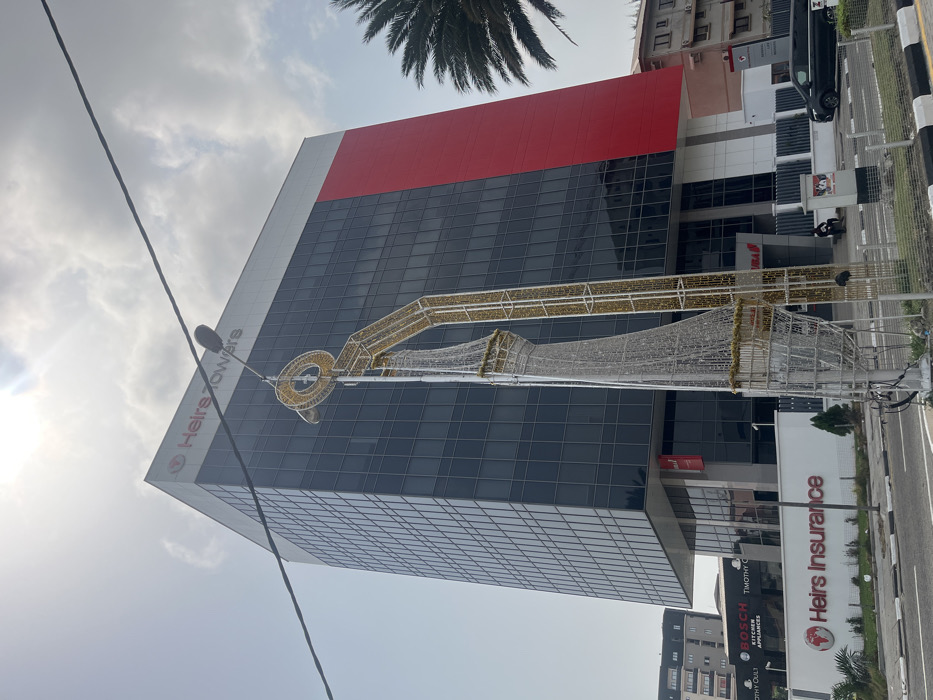 The image displays the "Heirs Towers" building in Itirin, Nigeria, under a bright, partly cloudy sky