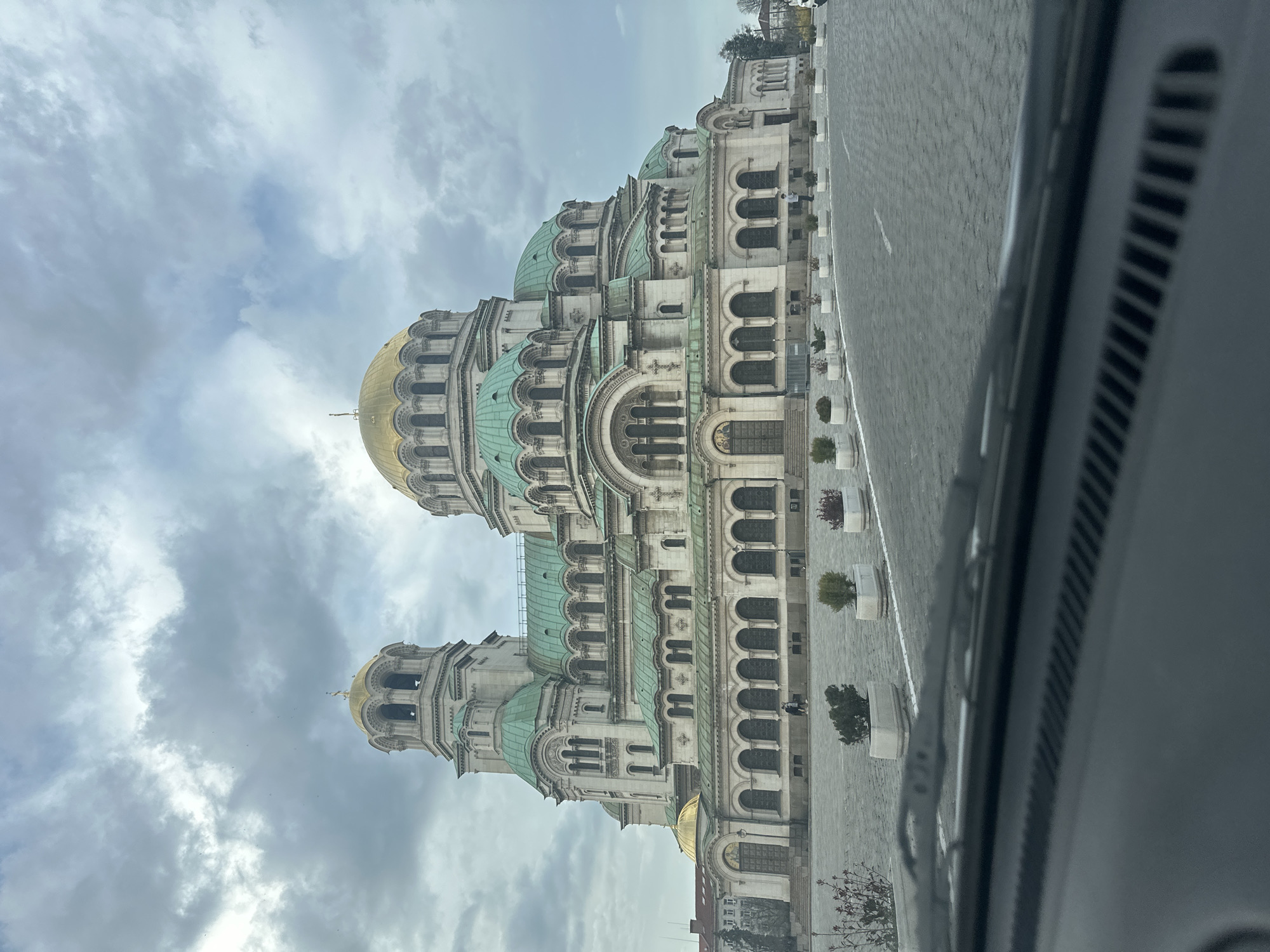The image captures the Saint Alexander Nevsky Cathedral in Sofia, Bulgaria, from a low-angle perspective, possibly taken from inside a vehicle. The cathedral's architectural details, including its gold domes, arches, and windows, are prominently visible against a cloudy sky. The foreground includes a paved area with occasional planters and a portion of a vehicle's interior, suggesting an urban environment. There are a few people walking next to the cathedral, but they are too far to be identifiable.