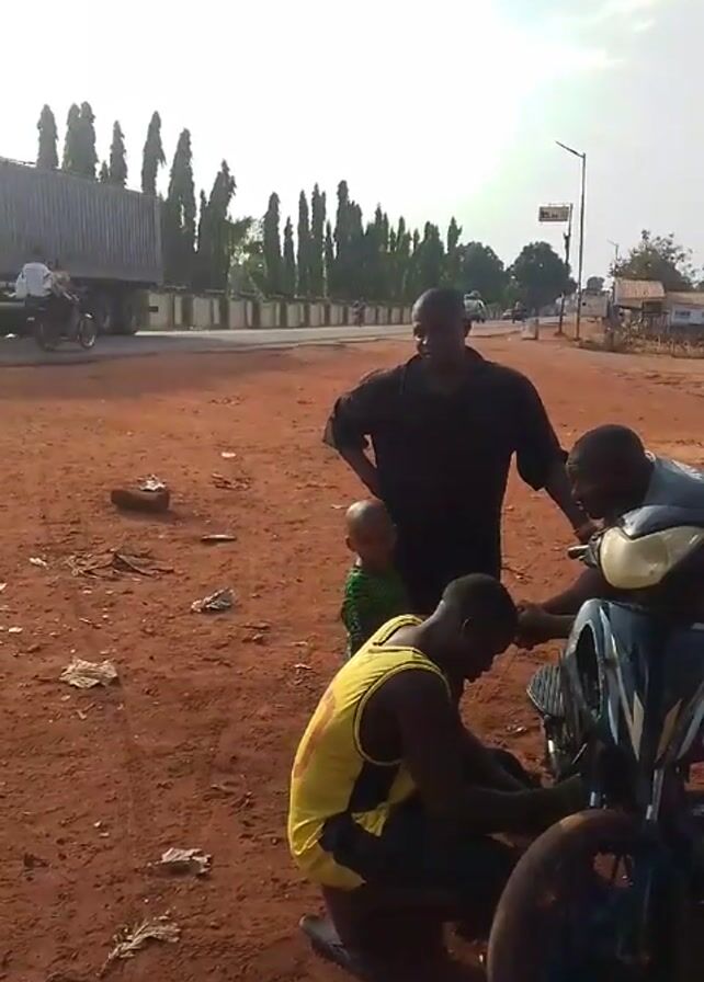 roadside scene where four people are gathered around a motorcycle. One man, wearing a yellow tank top, is kneeling and working on the front wheel. Another man in a black shirt is standing nearby, seemingly observing the repairs. A third man is partially visible behind the motorcycle. A small child wearing green is standing next to the man in the black shirt, holding his hand. The ground is red dirt with some litter scattered around. In the background, there is a road with light traffic, including motorcycles and a car passing by. A large truck is parked on the other side of the road. There are trees and buildings visible in the distance under a bright sky.