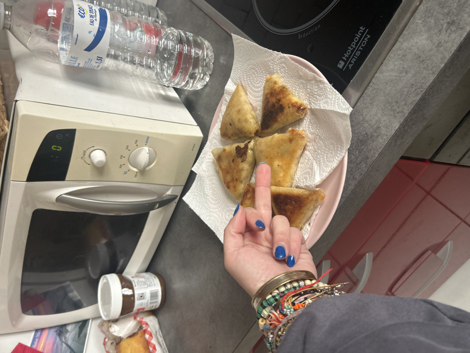 This image depicts a kitchen interior located in Incarville, France. A human left hand, adorned with multiple bracelets and featuring bright blue nail polish, is prominently positioned in the lower-left, extending its middle finger upwards. The wrist is covered by a dark grey long-sleeved garment. The hand is situated above a light pink plate that holds six golden-brown, triangular fried pastries, which rest on a white paper towel. Some pastries exhibit darker, slightly burnt areas. This plate is placed on a grey speckled countertop. To the right of the plate, a black induction hob, branded "Hotpoint Ariston," is visible. Below the hand and plate, a reflective red kitchen cabinet is present. Further back on the countertop, a jar of Nutella (hazelnut spread) stands next to a white paper bag with a red checkered pattern, containing additional food items. To the right of these, two partially filled 1.5-liter plastic water bottles, labeled "Éco+" and "EAU DE SOURCE," are visible. In the background, a beige microwave oven with a digital display showing "0:00" is positioned against a white wall. A framed image depicting a snowy mountain landscape hangs on the wall to the left of the microwave.