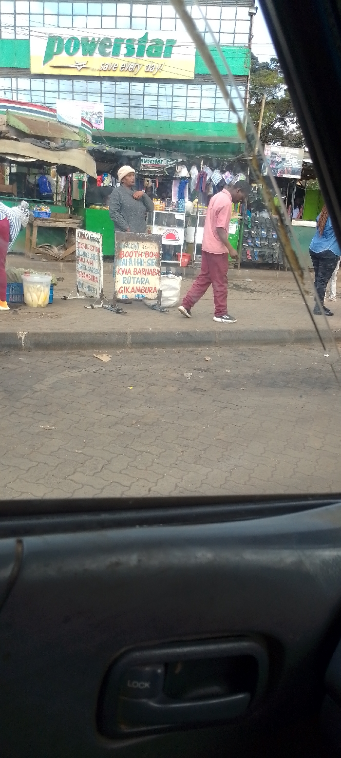The photo, taken from inside a car, shows a street scene with pedestrians and storefronts. A Powerstar store sign is visible. Street vendors are selling goods, evidenced by handwritten signs advertising locations such as "Kipagi Enco" and "Gikambura." A man in a pink shirt and maroon pants walks past the vendors. The car's interior features a "LOCK" button on the door panel.