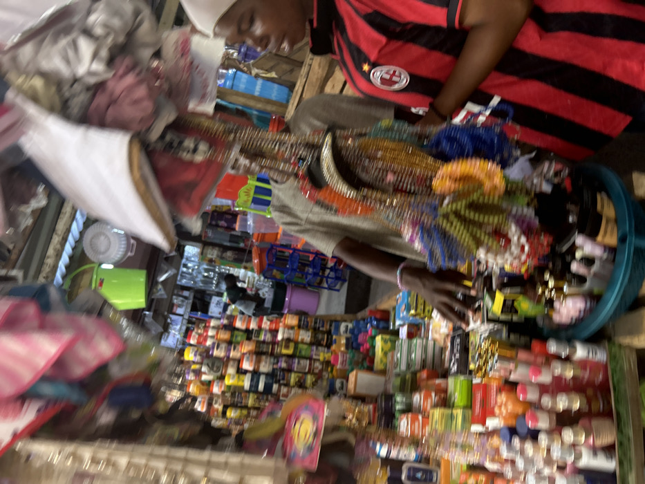 A person wearing a red and black striped shirt stands at a stall filled with merchandise. Items like hair accessories, containers, and packaged goods are visible. The stall seems densely packed with various products. The person appears to be examining or arranging items within the stall. The overall setting suggests a bustling market or small retail environment.