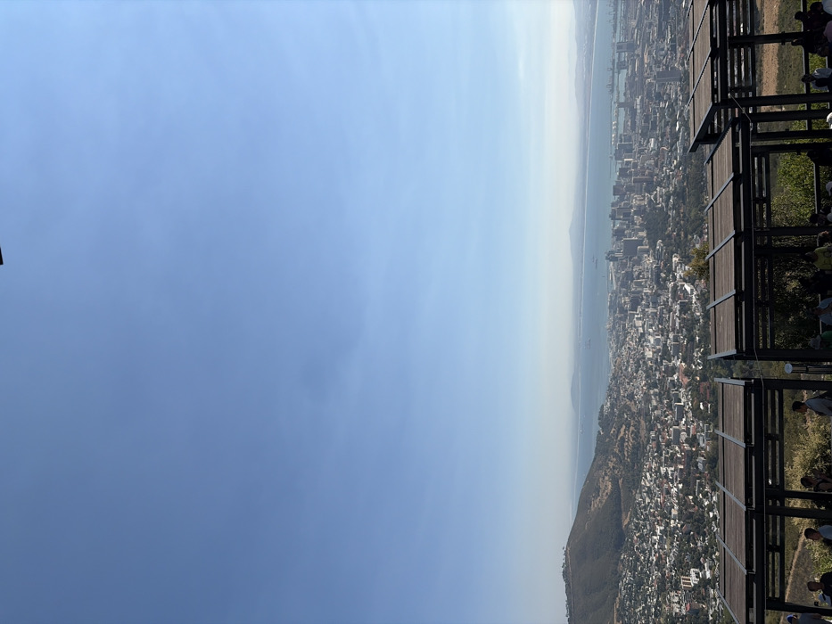 A scenic overlook features a city, ocean, and mountains under a clear blue sky. The cityscape is dense, extending along the coastline. A viewing platform with wooden decking and metal railings lines the right edge of the image, with people standing on the platform. A mountain with sparse vegetation rises in the foreground, leading down to the city. Haze obscures the distant horizon where the sky meets the water.