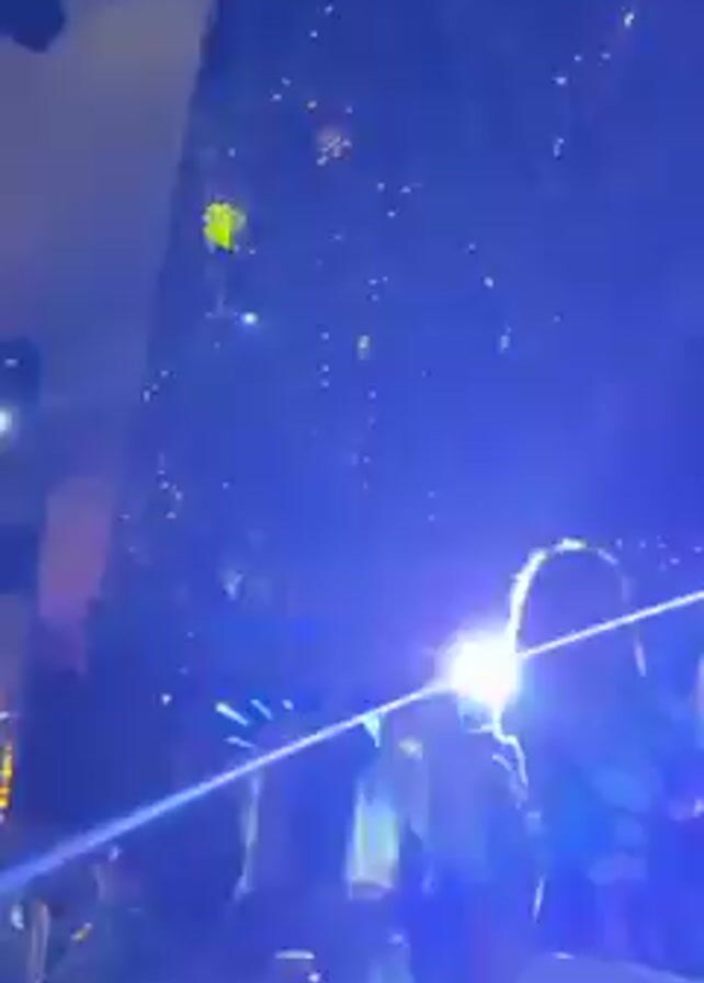 The video depicts a lively atmosphere in what appears to be an outdoor bar or event space, likely at night. Several people are visible, mostly with their backs to the camera, indicating they are facing a performance area. Colorful stage lighting illuminates the crowd, creating vibrant beams of red and blue. Above, decorative greenery and strings of lights give the space a festive ambiance. In the foreground, tables hold bottles, glassware, and other items, suggesting a typical bar setting. People in the crowd are dancing and possibly raising their hands, implying they are enjoying the music or entertainment.