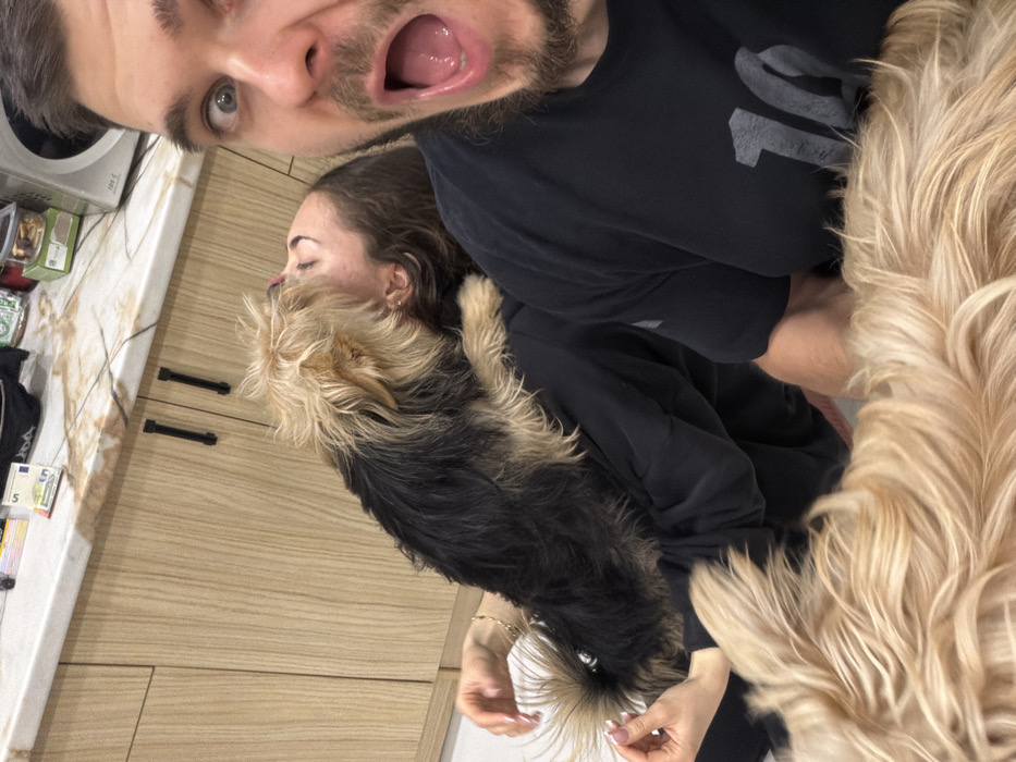 This image depicts an indoor domestic scene, likely a kitchen or an adjacent living area, situated in the city of Pernik, Bulgaria. The foreground is dominated by a close-up selfie of a male subject with a beard and mustache, exhibiting wide blue eyes and an open mouth with a surprised expression. He wears a dark t-shirt displaying a light-colored number "10." To his left and slightly behind, a female subject with dark hair is partially visible, wearing a dark long-sleeved top. Her head is tilted back, eyes appearing closed, as a small, shaggy-haired dog, black with blonde markings, rests on her chest, its head near her face, possibly licking it. The woman's manicured hands are visible near the dog. In the bottom foreground, the light blonde, wavy fur of another, larger dog is present. The background shows a light-colored, veined countertop with two 5 Euro banknotes, a clear plastic container, and a portion of a white appliance. Beneath the countertop are light wood-grain cabinets equipped with dark, vertical handles.