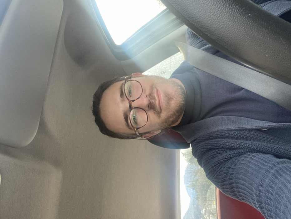 A selfie taken inside a car shows a man wearing glasses and a navy blue sweater