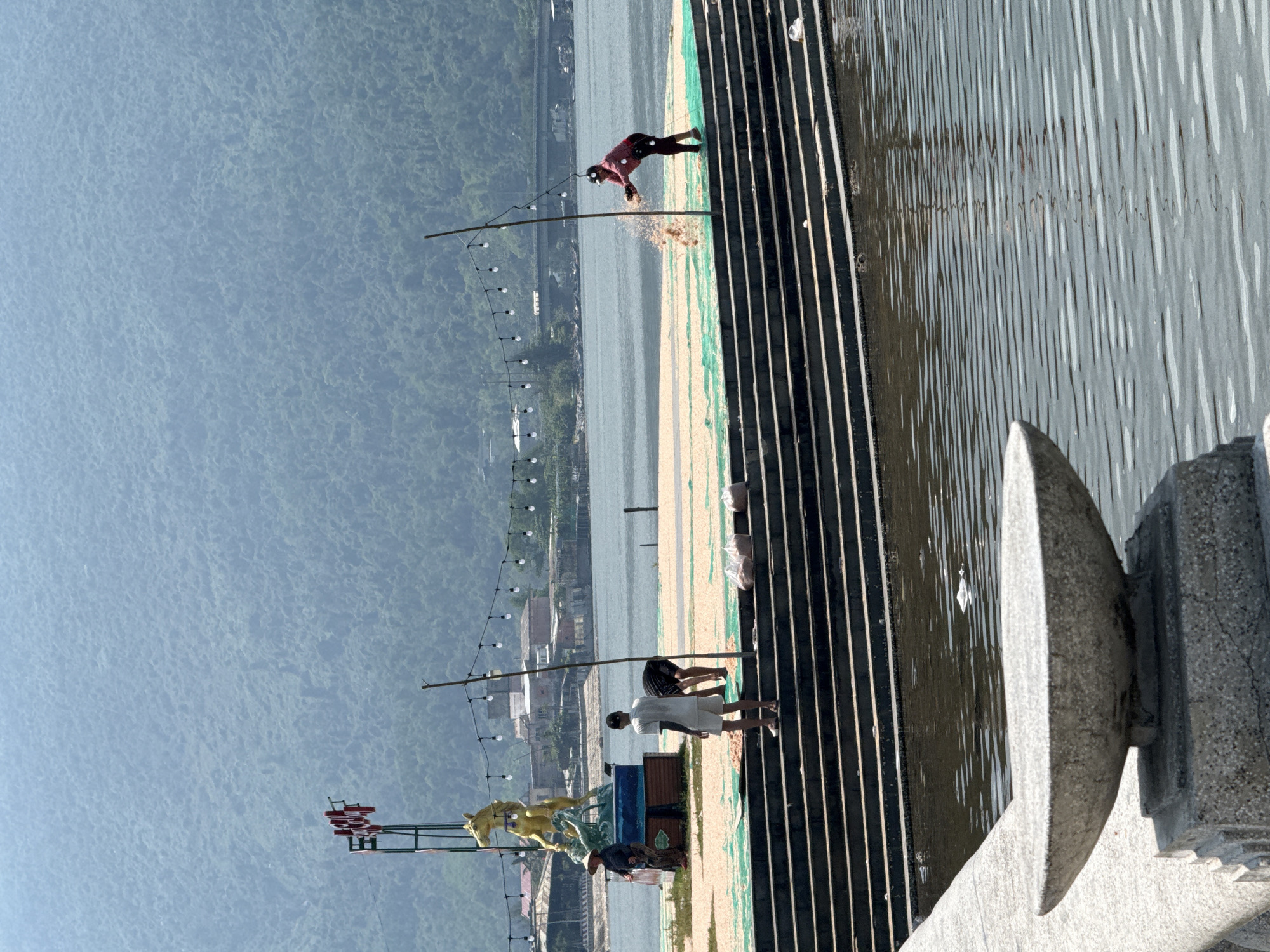The image depicts a waterfront scene in Huế, Vietnam. In the foreground is a stone pier or walkway with vertical metal railings and an ornate stone post. The water is visible beyond the railings. Along the pier, there are several people: One individual is wearing a white outfit, and another is wearing a red outfit. Further away, there are carnival-like structures, including what appears to be a horse statue. String lights are suspended on poles. In the background, there is a view of a mountainside across the water.