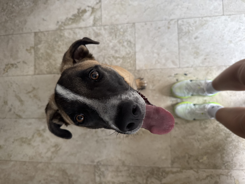 - "An overhead perspective captures a medium-sized, mixed-breed dog looking directly upward at a person's lower legs and feet" by FM-CWiHC2, licensed under CC BY 4.0