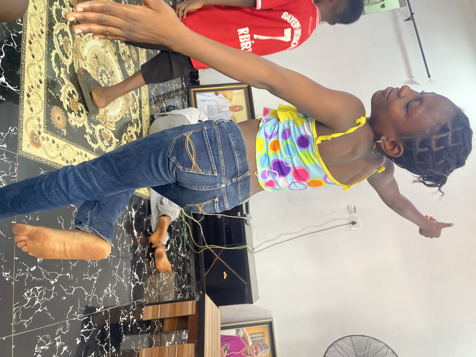 The scene is an indoor domestic environment in Idah, Nigeria, featuring three individuals and various household objects. In the foreground, a young female, approximately 8-12 years old, stands with her body slightly turned to the viewer's right. She wears a light blue sleeveless crop top with colorful polka dots and yellow spaghetti straps, along with blue denim jeans. Her hair is styled in multiple small braids. Her right arm is extended upwards and backward with the thumb raised, and her left arm is extended forward and downward. Her head is turned to her right, looking back over her shoulder, with her eyes slightly closed and a faint smile. She is barefoot; the sole of her right foot, partially visible, appears dusty. To the left of the primary subject, a male child, partially visible, walks towards the left. He wears a red t-shirt with "BAYERN MUNICH" and the number "7" on the back, black shorts, and a dark slide sandal on his left foot. In the mid-ground, a third individual lies prone on a black tiled floor, with only their lower legs and bare, dusty feet visible. The room features a patterned black tiled floor with white veins, and a section of lighter, patterned tiles resembling a rug in the left mid-ground. The walls are plain and light-colored. Various objects are present in the background: a dark-colored entertainment unit or cabinet with cables (yellow, green, black) draped over it, two framed portraits leaning against the wall (one of a man in white traditional attire, another of an older man in purple traditional attire holding a phone), and a small, dark wooden two-tiered table on the far right. A dark wall-mounted fan is visible on the right wall, along with two electrical outlets.