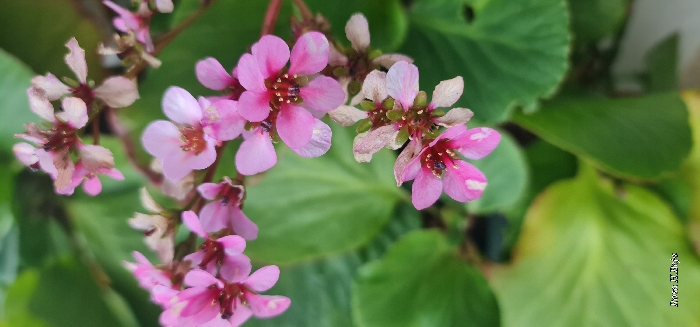 Clusters of vibrant pink flowers intermingle with lush green foliage. The petals of the blossoms showcase varying shades of pink, some lighter, some deeper, creating a beautiful contrast. The leaves are large and round, with smooth edges, adding to the overall visual appeal of the flora. The photo captures the delicate beauty of nature.