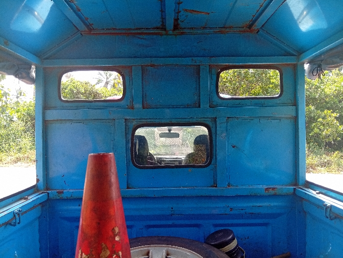 The image displays a view from the cargo bed of a blue utility vehicle, looking forward through its cabin partition into Ejule, Nigeria