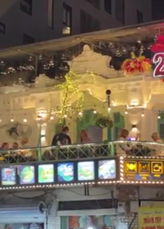 At night, a street-level view shows a two-story building in Vietnam, with a sign above reading "HANOI 2026". The upper floor is an open-air restaurant with several people dining and drinking. String lights and decorations adorn the building. Below, street vendors are present, with a food cart visible. The lighting is bright, contrasting with the dark sky.