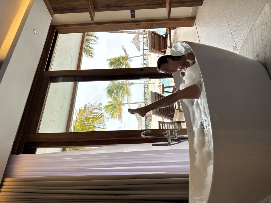 A woman relaxes in a white, oval bathtub filled with bubbles. She is facing the left of the frame, and her right leg is visible outside the tub. A large window with a wooden frame behind the tub shows a tropical outdoor scene. Palm trees, lounge chairs, and a glimpse of a pool can be seen beyond the window. White curtains hang partially over the bottom of the window.